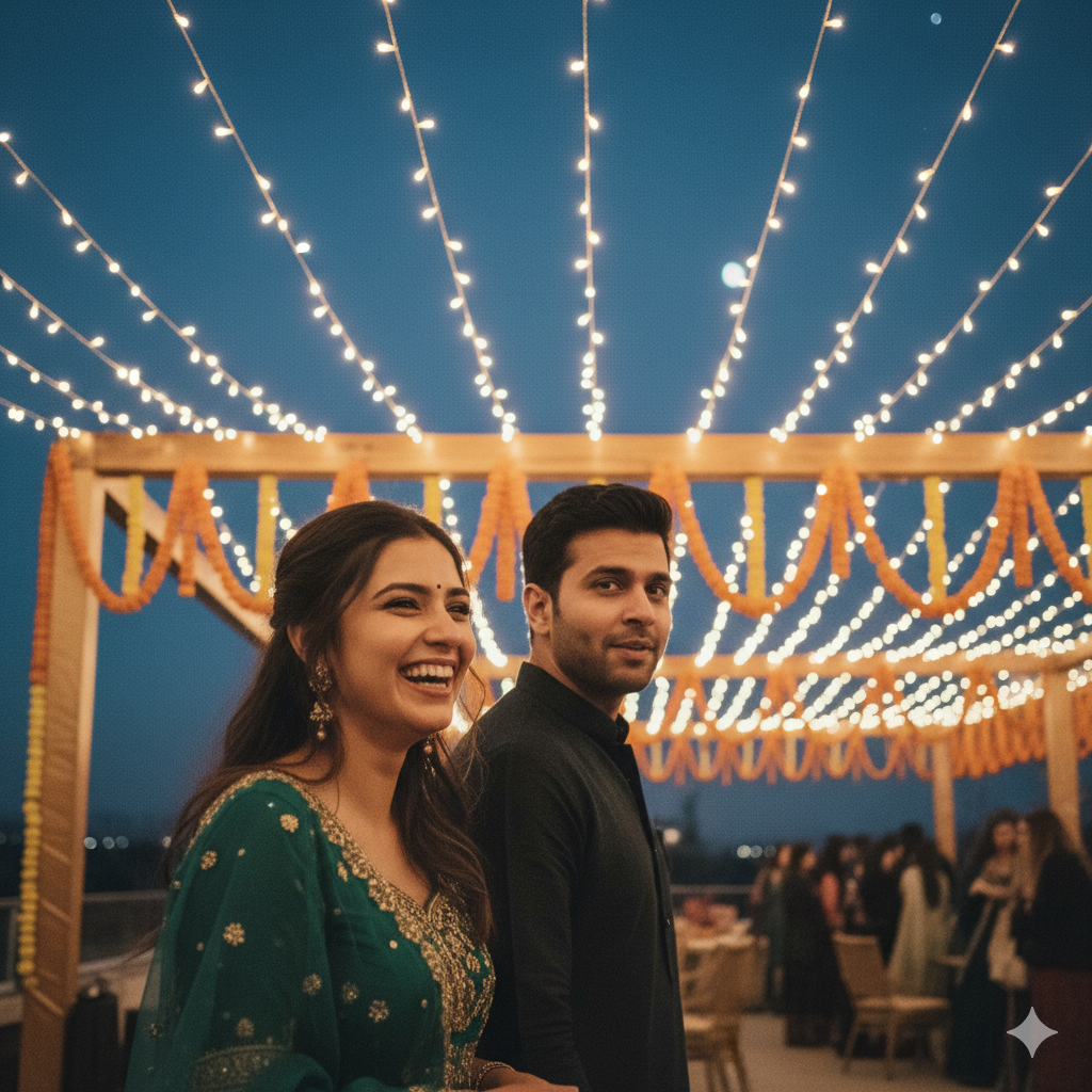 Later, when the music started and the terrace lights flickered, I was wrestling with a fairy-light pole that wouldn’t stay straight. Rahul appeared beside me like he had been waiting for the right moment.
