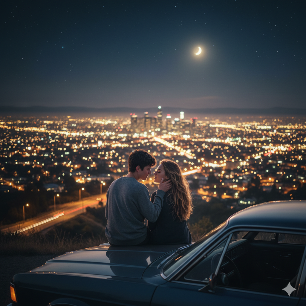 We sat on the bonnet of his car, shoulders brushing. He told me about his dreams, and for the first time I let myself speak mine out loud too. The air between us grew quiet, heavy but warm. When he leaned closer, I froze for a second, then closed my eyes.
